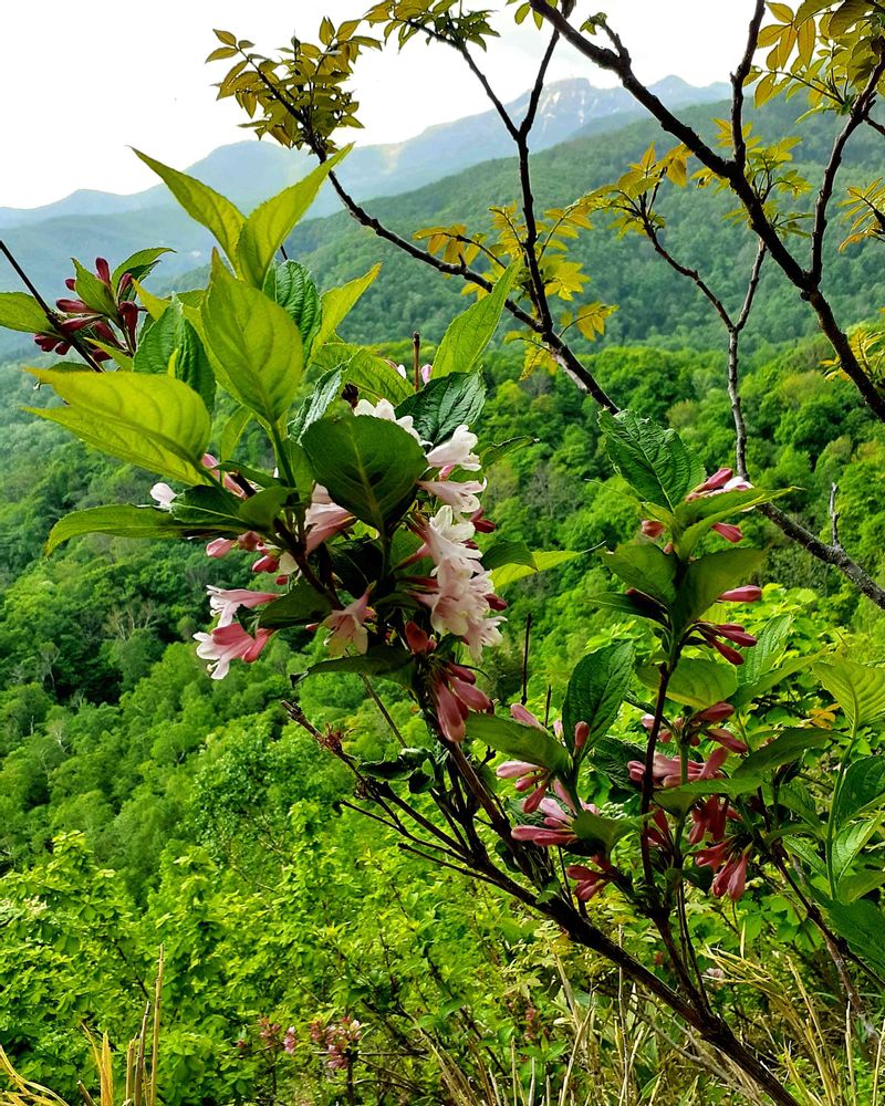 優しい色目のタニウツギ🌸🌸🌿後ろの峰々や緑が生き生きしてますね🏞️💕
