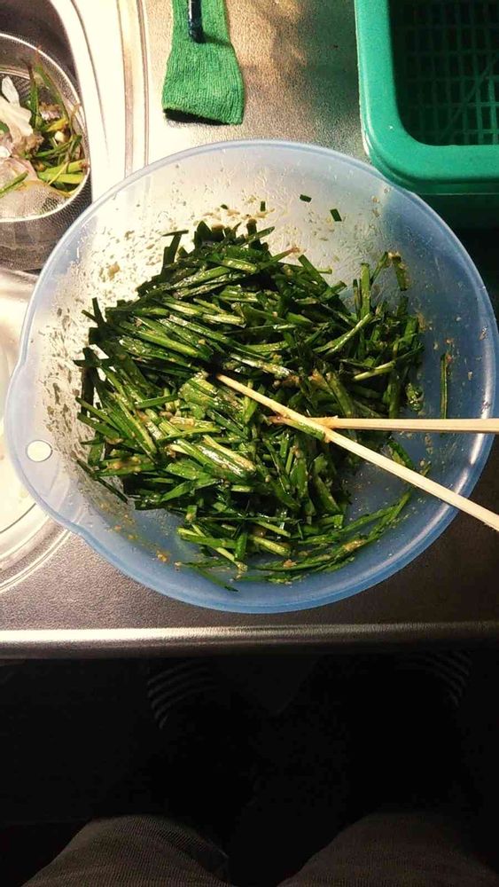 「悪魔の壺」🍯(パック)入れる前😉GS眺め知り、家庭菜園に韮(にら)あり😓🤔 ○の素の替わり顆粒だしで😂挑戦😀 👵👩から評判よかった😄自宅のにらは先端茶色になり始め、先端チョン切り緑だけにしてつくりました😏これ二度目👀二回目🎵
