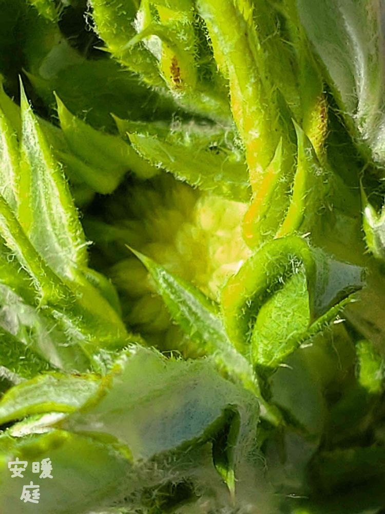 蕾んでいる葉っぱを広げて(チクチク痛い)覗いてみたら、準備中の様子💕