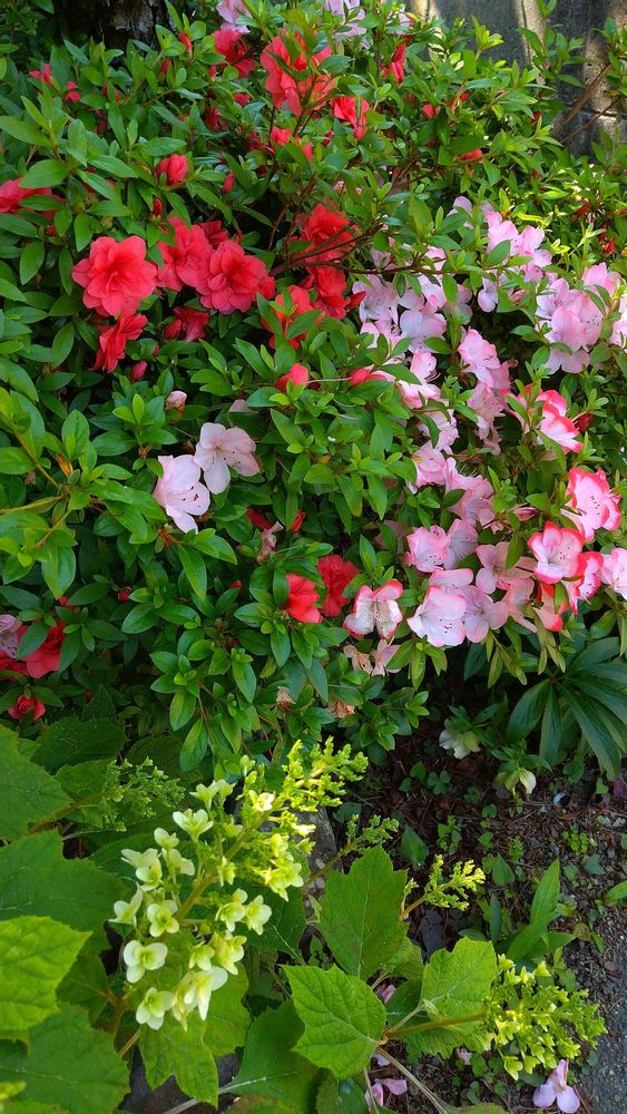 遅咲きのサツキと早く咲くかしわば紫陽花のコラボです😀