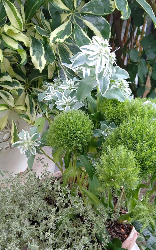 グリーンのラナンキュラスが終わったので てまり姫(ナデシコ科ナデシコ属)とユーフォルビア(初雪草)に交代です💚