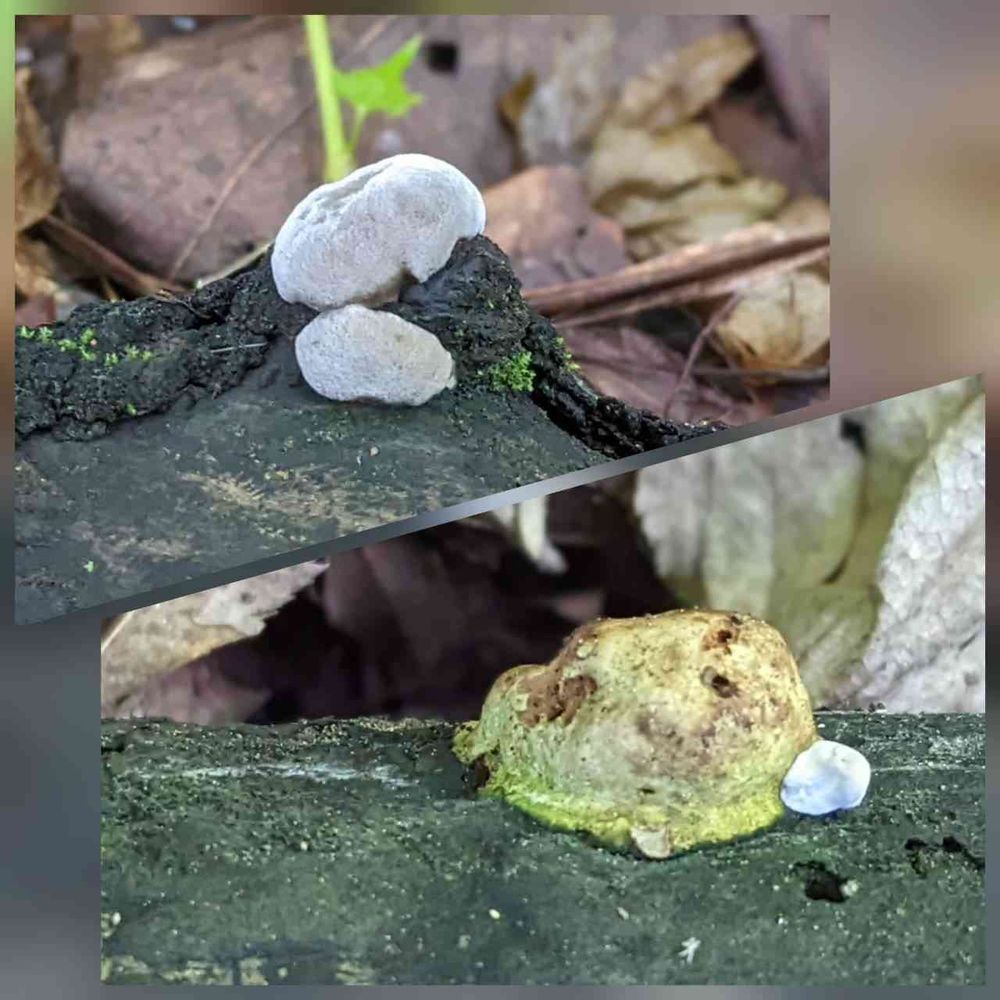 上の白いキノコは 数日前ペタッと平たかったのが盛り上がって来ました 下はそれと同じ様な白いものも付いていますが 何か人のお面の様にも見えてしまいます