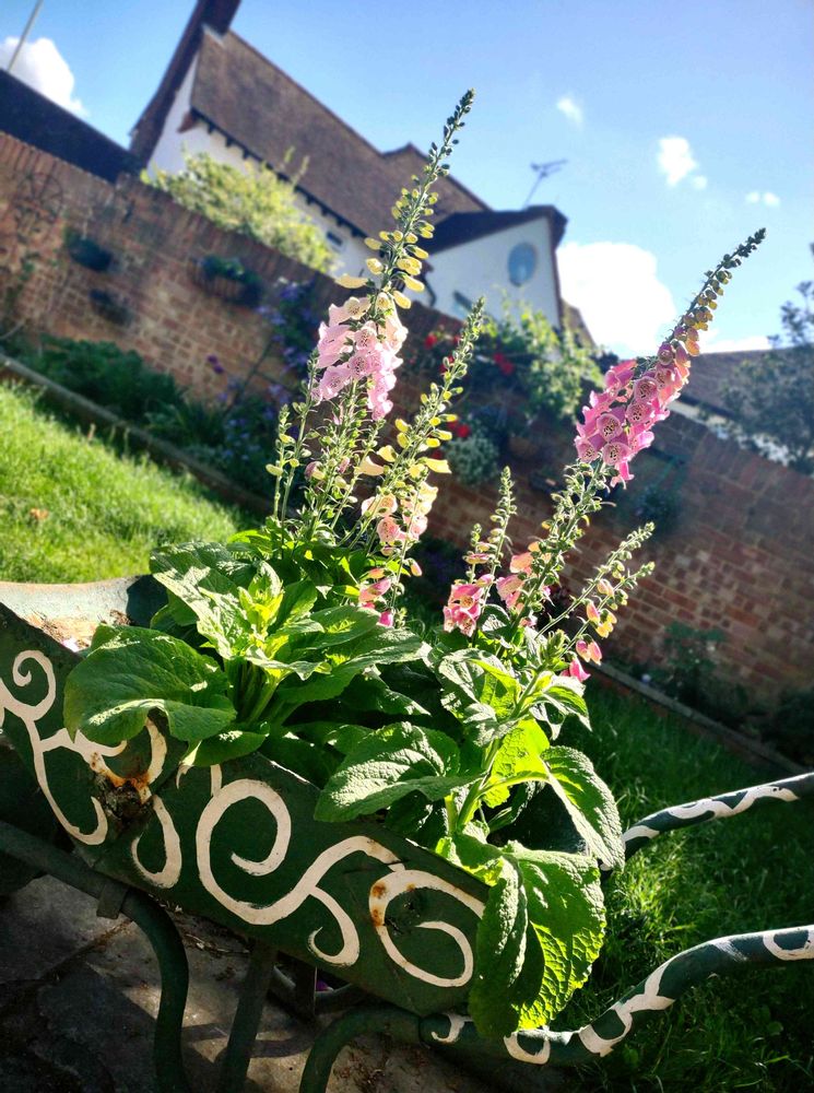 ジギタリスは、場所を取るので私の初DIY作品のArabesque barrow、いやカッコよく言い過ぎましたが、唐草模様風一輪車😅にまとめてあります🤭
