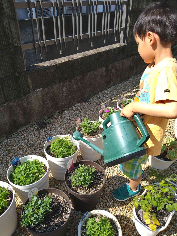 サントリーさんからいただいた苗たちを、息子が、水やりしてくれています。そして、鉢いっぱい並べて、ウキウキしている私❤