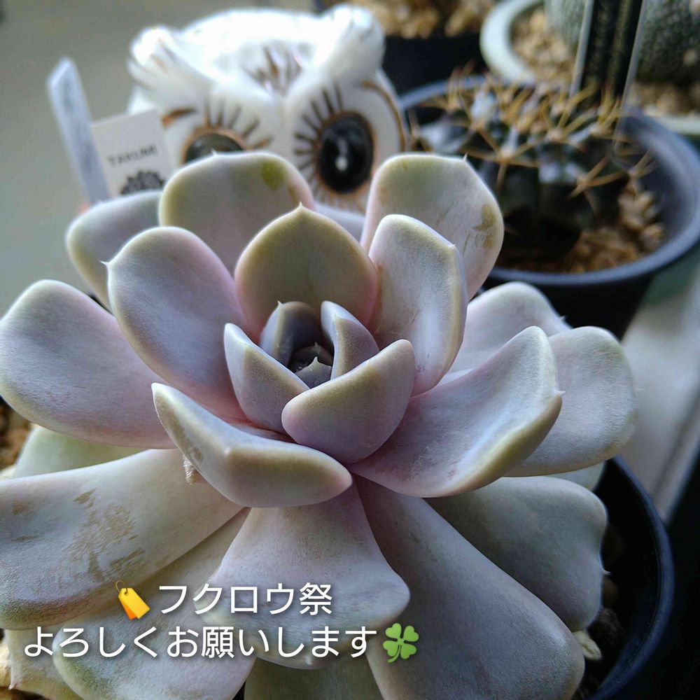陶器のような艶やかな多肉さんの向こうから覗くつぶらな瞳のフクロウさんが可愛いですねー😍