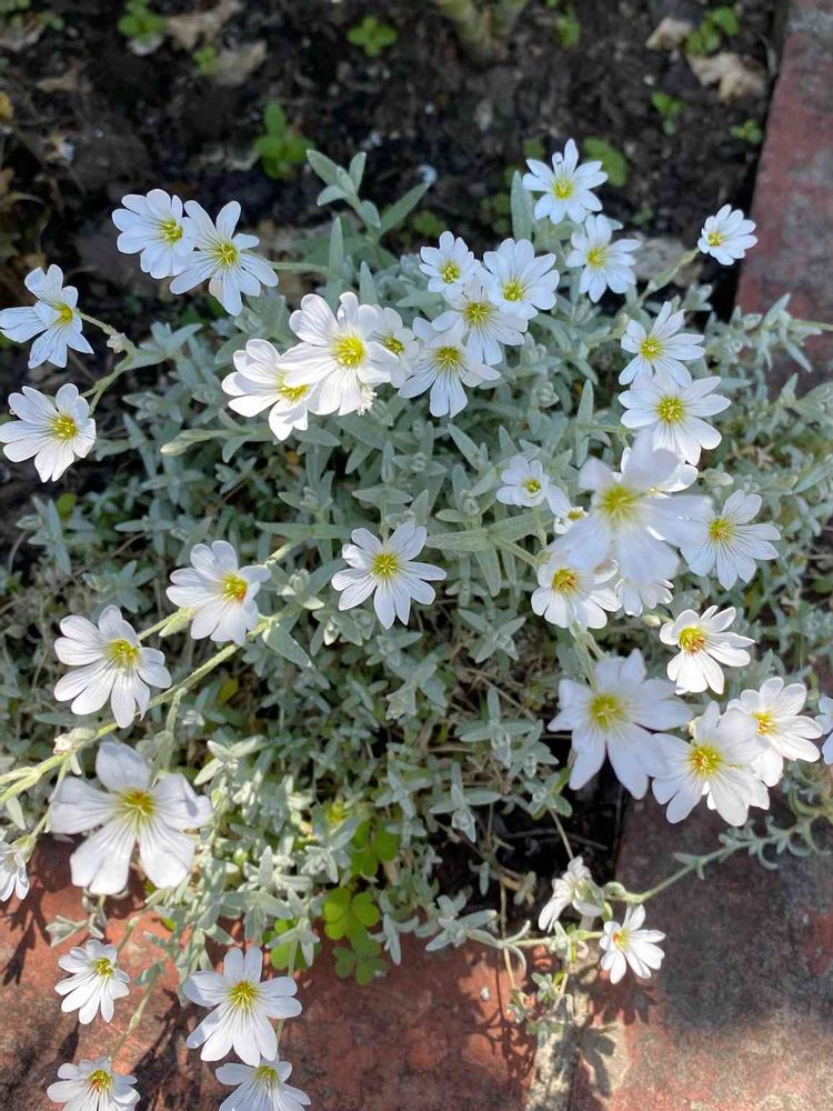 シルバーリーフに白い花🌼がかわいい❤️です。この頃、花数が増えてきてうれしい🎶