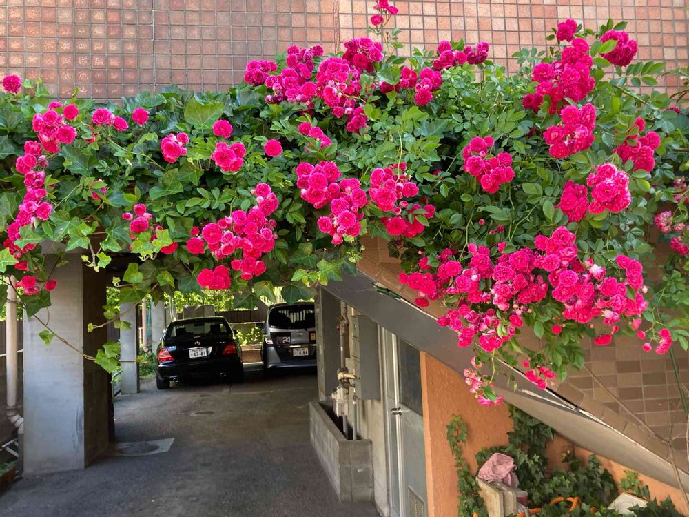 仕事の帰り道にあるマンションの駐車場入り口に小さなピンクの薔薇が花を咲かせていました。