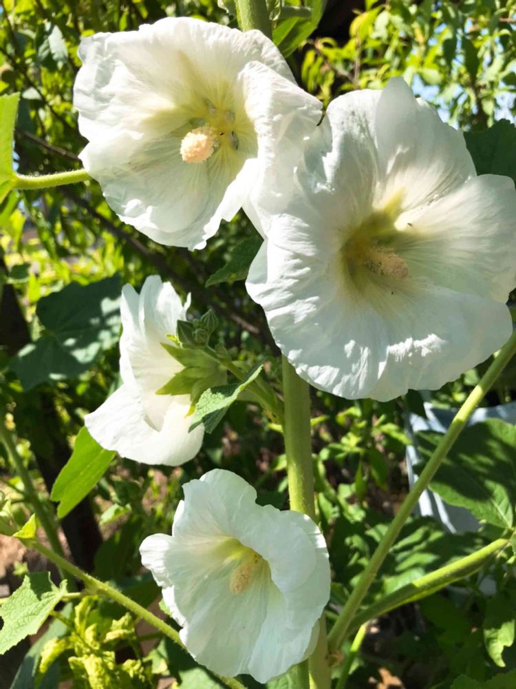 白いタチアオイ🤍4輪咲いています♪まだまだ蕾がたくさんあるから暑くてもへっちゃら☀️夏日の今日は日焼け対策しっかりと〜!わたしは顔にクリームを塗っているだけですが…パーカーの帽子部分をかぶって頭あちち🔥にならない様にしてます👒