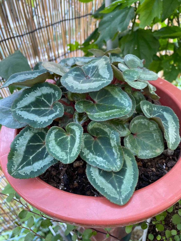 2022ー5ー29(日)晴れ☀️ 小さい庭の簾の下で🪴シクラメン ワーリーギグの葉っぱが盛り返してきていました😃