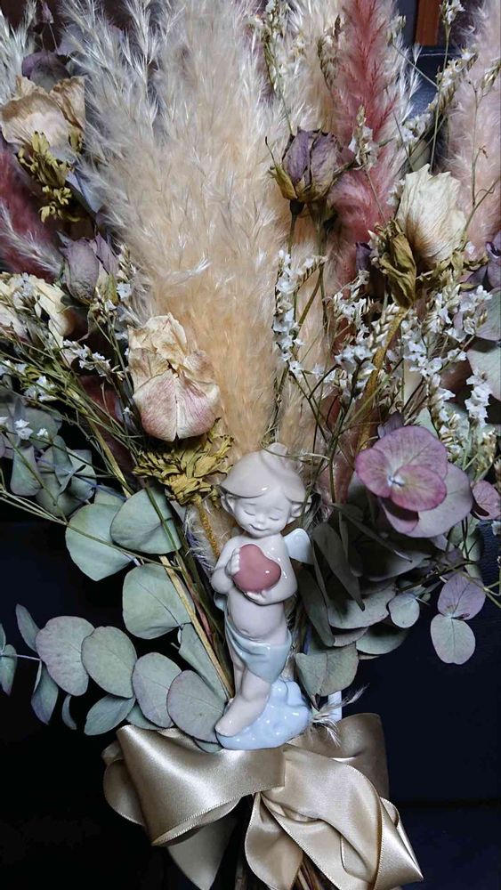 ところがエンジェルは用意できたのに、植物が無いやないか😱💦と探し回り、3月の娘の結婚式のブーケが良い感じにドライになっていたのでコラボしてみました💐👼💕