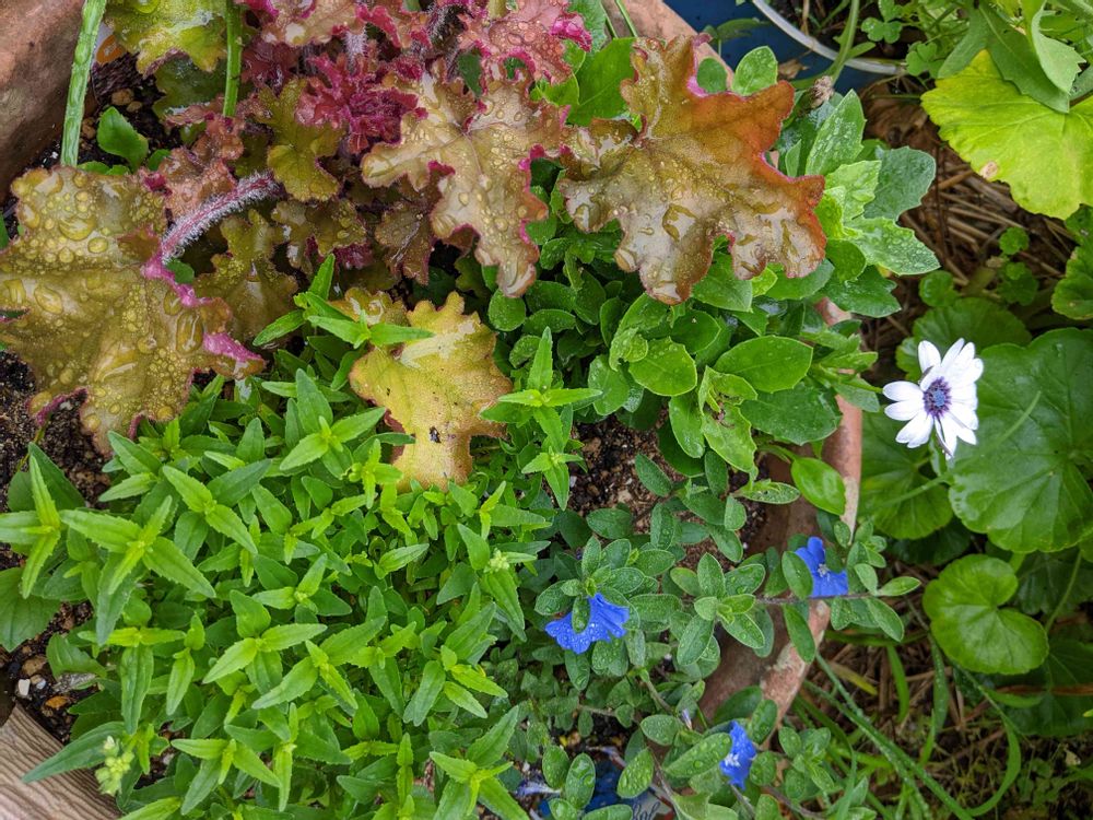 寄植えです。ヒューケラ。アメリカンブルー。その他?🤭