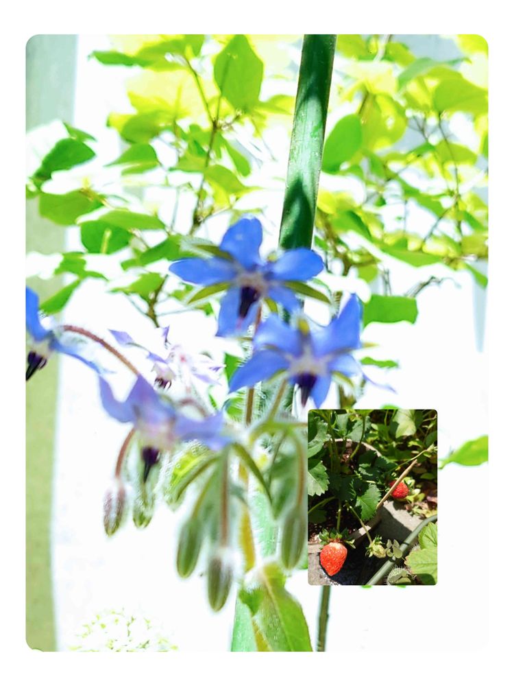 いちごとボリジ❤️ってボリジとってたら最近ボリジ、ルピナス、ブルーサルビアのブルートライアングルを縄張りにしてる蜂がスマホに体当たりしてきました。命がけのショットです😂