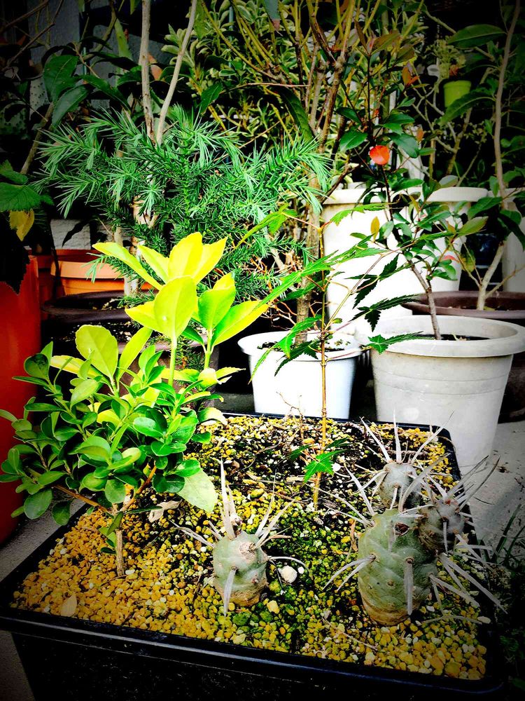 この寄せ植えなんだかんだでしたサボテンの武蔵野とボックスウッド、マサキ、もみじと相性がよかです😎