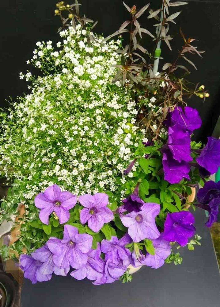 昨年末に葉牡丹と寄せ植えしてて、サフィニアに衣替え😆🙌