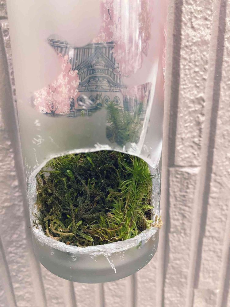 以前購入したお酒の瓶をそのまま捨てるのも勿体無いな〜と思い、これまた前から気になっていたテラリウムにに挑戦!瓶に穴を開けるのにちょい(?)ミスってヒビが入ってしまった•••。赤玉を潰してその上にシッポゴケとハイゴケを置いてみました。
