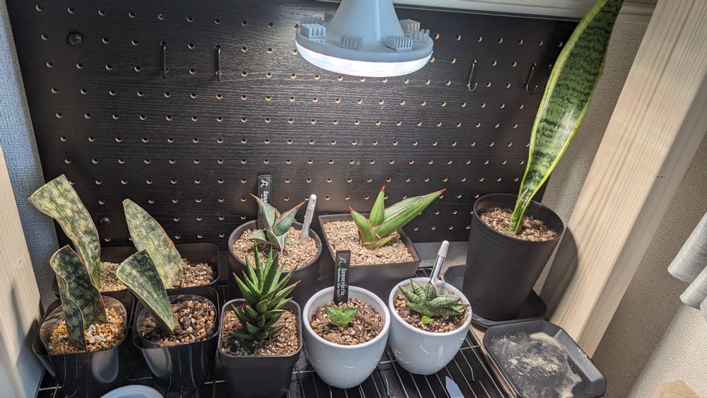 サンスベリアがいっぱい!しかも育成ライトでしょうか。底は通気も良さそうで、植物にやさしい環境ですねっ!みん心地よさそうです(o^^o)♪