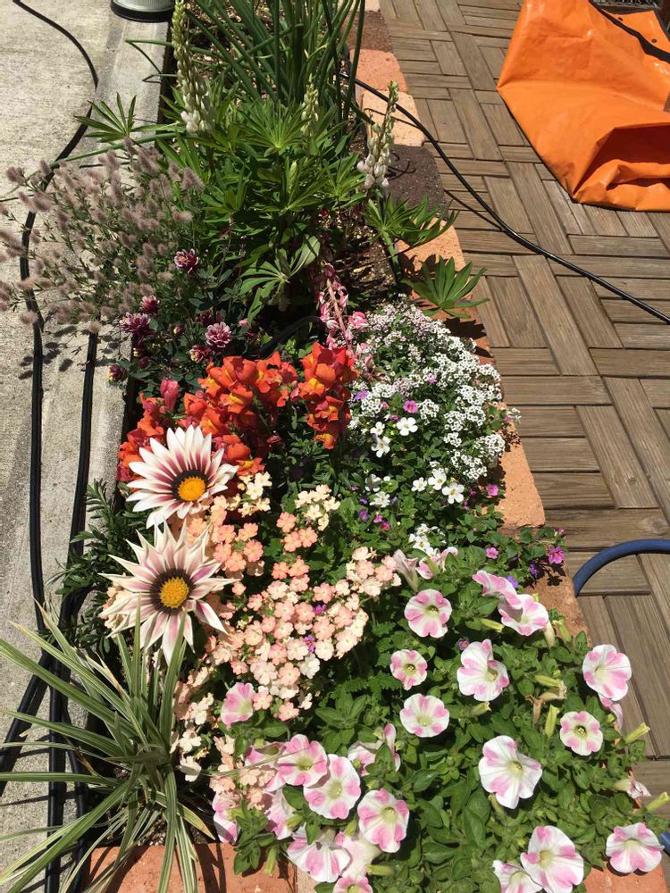 作業中で散らかってますが植え込んだ時はスカスカだった花壇が花もりもりになりました!今年はずっと探してたストライプのガザニアやトリフォリウムバニーズ(写真左奥ふわふわ)が手に入って毎日がウキウキです。