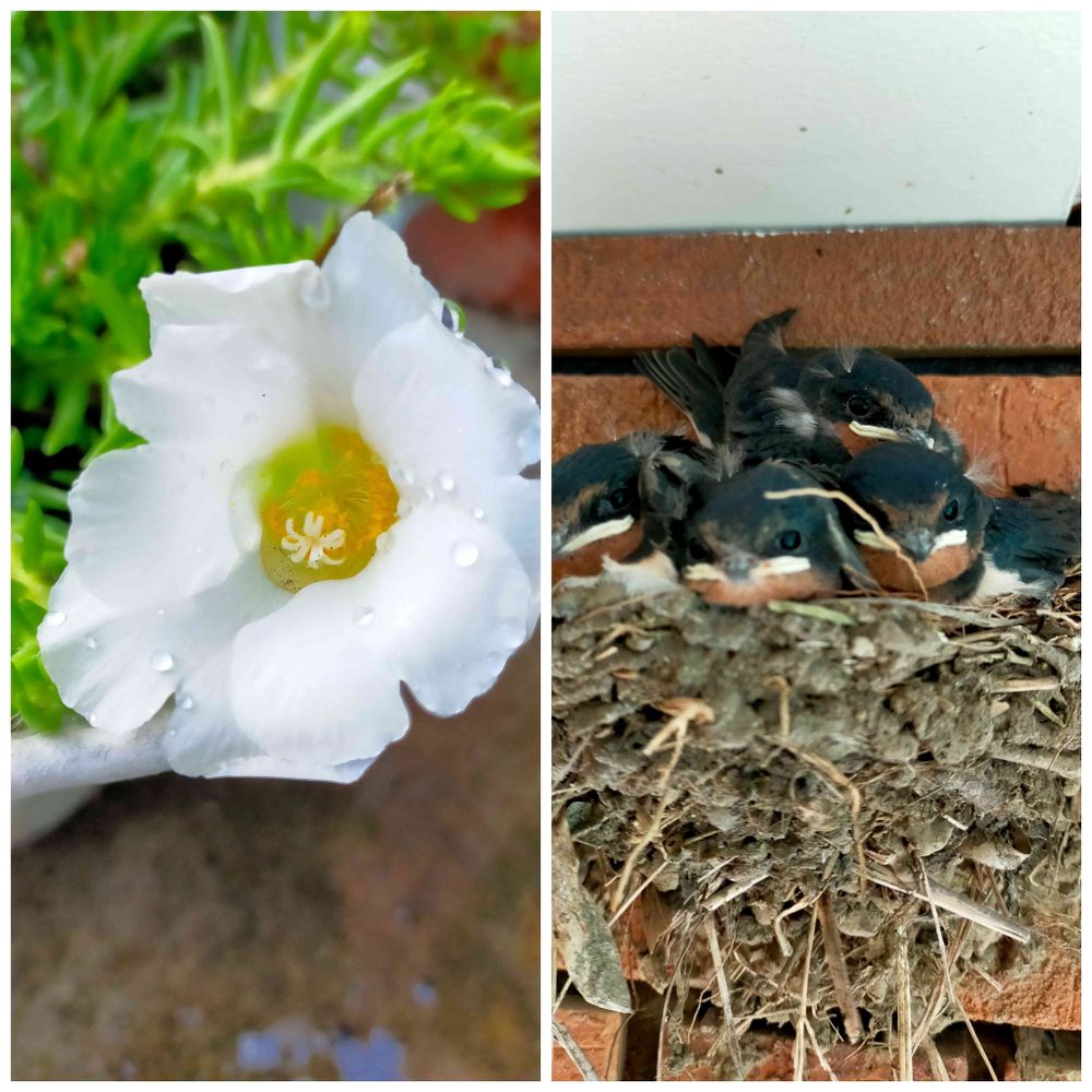 おはようございます!冬越しから初めて花を咲かせたマツバボタンと、すくすく成長中のツバメちゃん💕