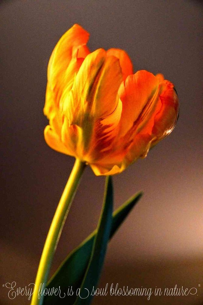 5月上旬に夜間リビングの鉢植えのチューリップを撮影しました。ジェラール・ド・ネルヴァル(19世紀に活躍したフランスの詩人)の言葉、『全ての花は自然界の中で開花した魂である。』が好きで英文で付け加えています。🤭💓