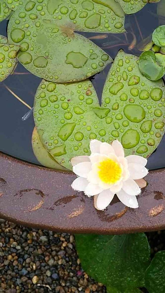 雨の中、メダカ鉢の睡蓮が咲きました。