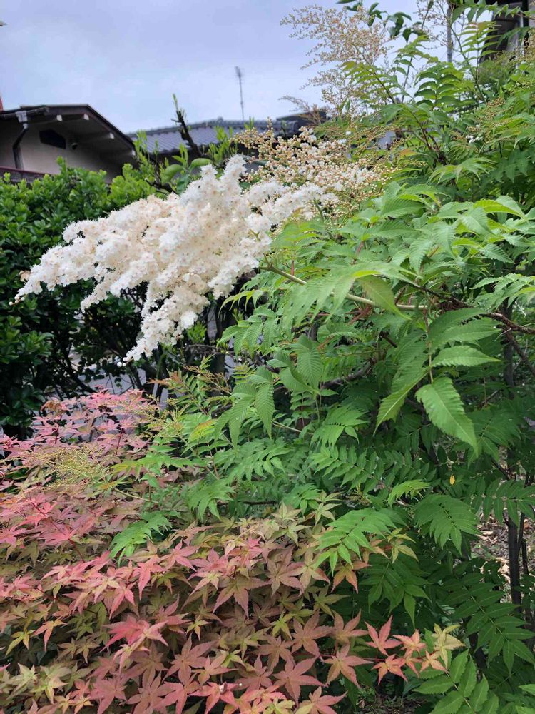 私の好きな ニワナナカマド真っ白な花が、咲いてきた 葉っぱの緑🌿下のもみじ🍁とのグラデーションもいい感じです❣️