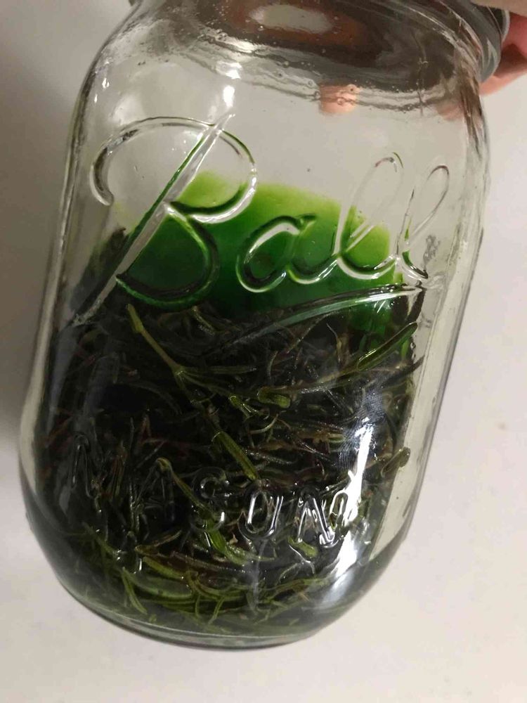 ローズマリーチンキを作るため以前乾燥させたローズマリーを無水エタノールに漬けました✨