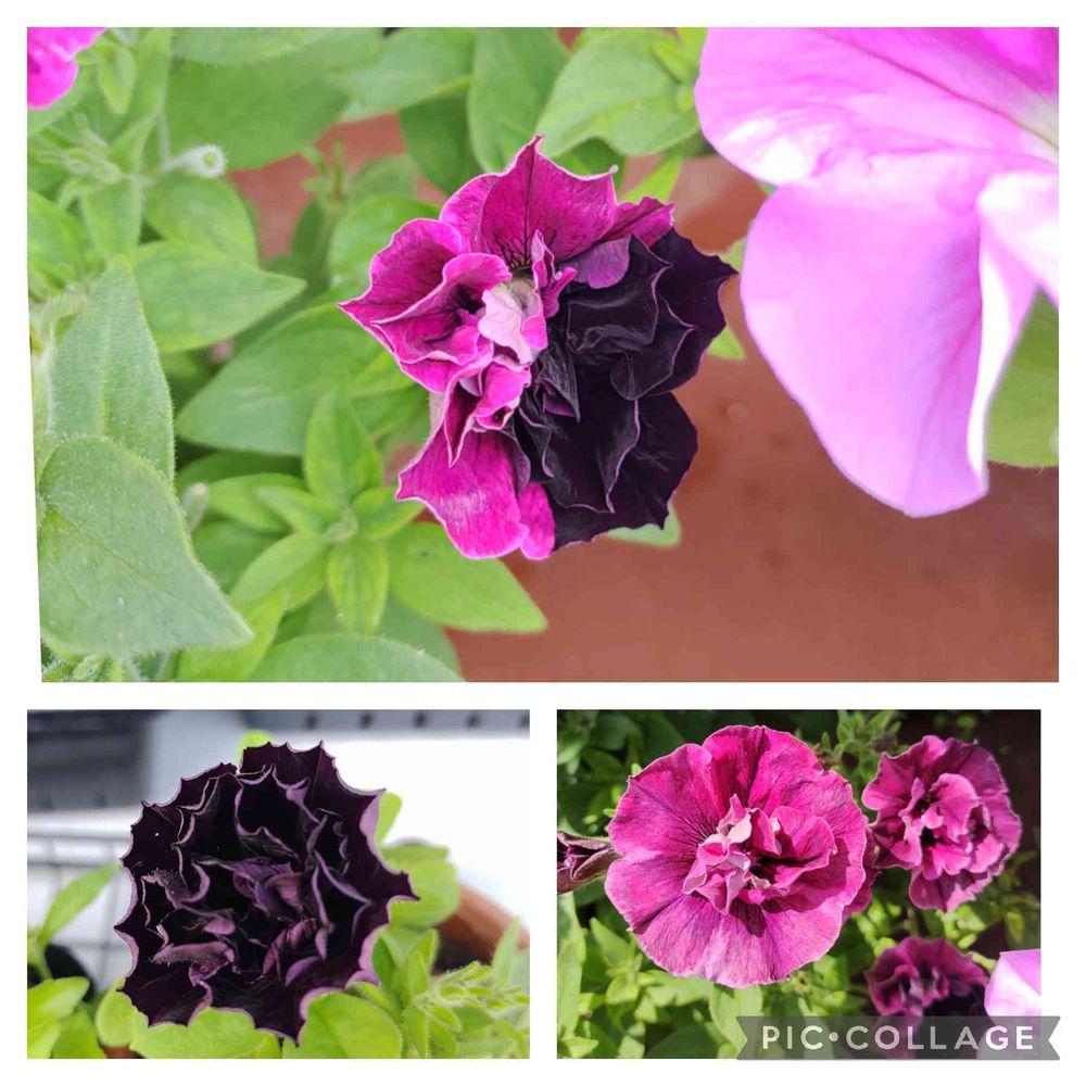 下は冬越しした八重咲きのペチュニアで、アンティークカラーの左がブラック、右がピンクなんでしょうが、2色で咲いちゃったお花は挿し芽で増やしたピンクの鉢の中にいました。