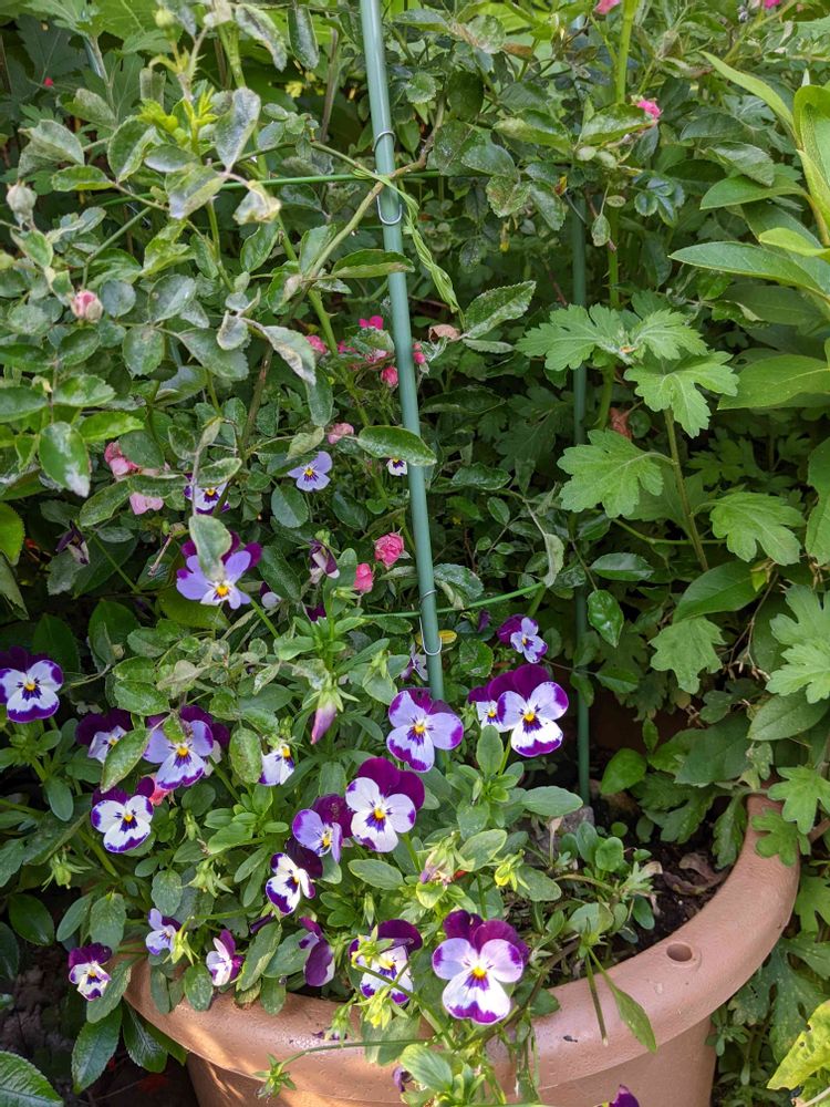 ビオラとミニ薔薇!もうちょっと、綺麗に仕上げたかったけど、ミニ薔薇が、ハダニに負けて、中々薬かけても、もどらない。花はなんとか咲いてきましたが、葉っぱが、元気ない。😢😭😆