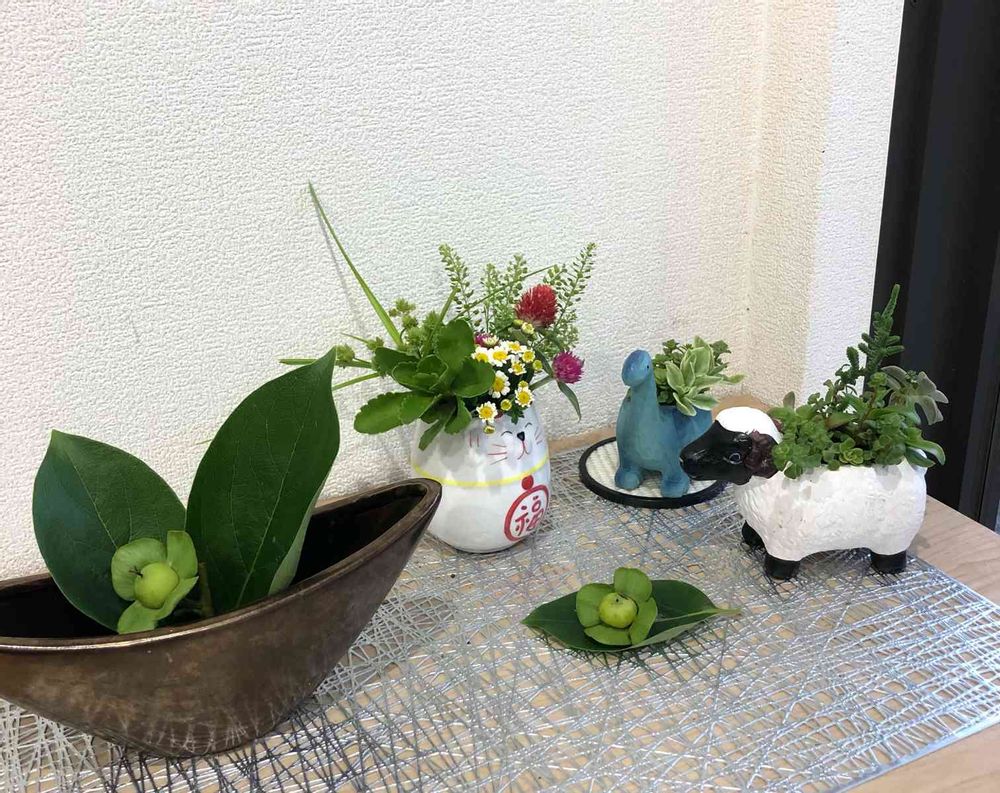 新入り猫ちゃんの縁起の良さそうなふっくらシェイプはこの先活躍しそうですね。素朴なお花もにあっています。