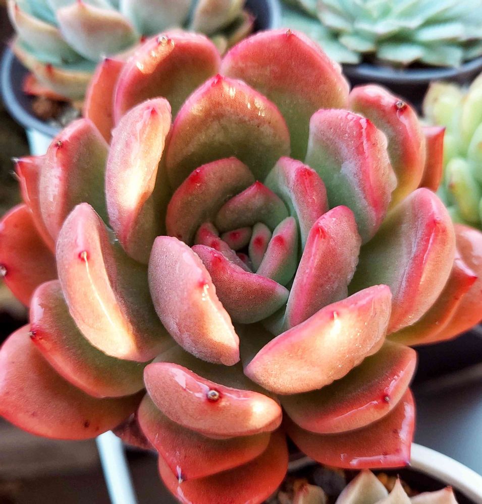 みんなすっかりみどりんになった多肉達のなかで、グラムピンクが艶やかな赤色をしていて目を惹きます😄