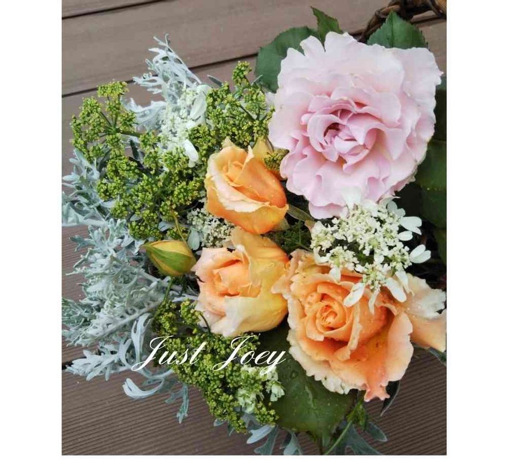 パセリのお花が可愛いかったのでダスティミラーと最後に咲いてきたバラで💐