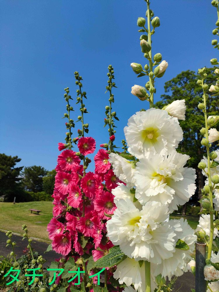 紅白のタチアオイ、青空に映えてとても綺麗ですね💗🤍