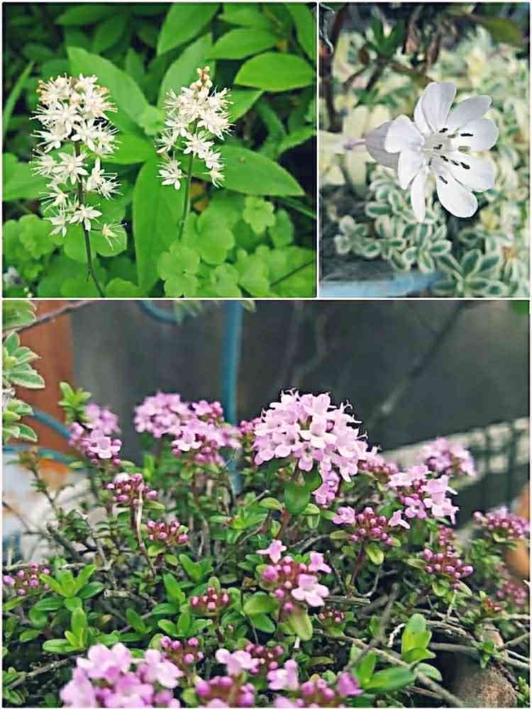 金平糖のようなティアレア、昨年買ったのに咲かなかった斑入りのシレネ、毎年小さな鉢植えなのに咲いてくれるハーブのクリーピングタイムが今年も顔を見せてくれました☺️