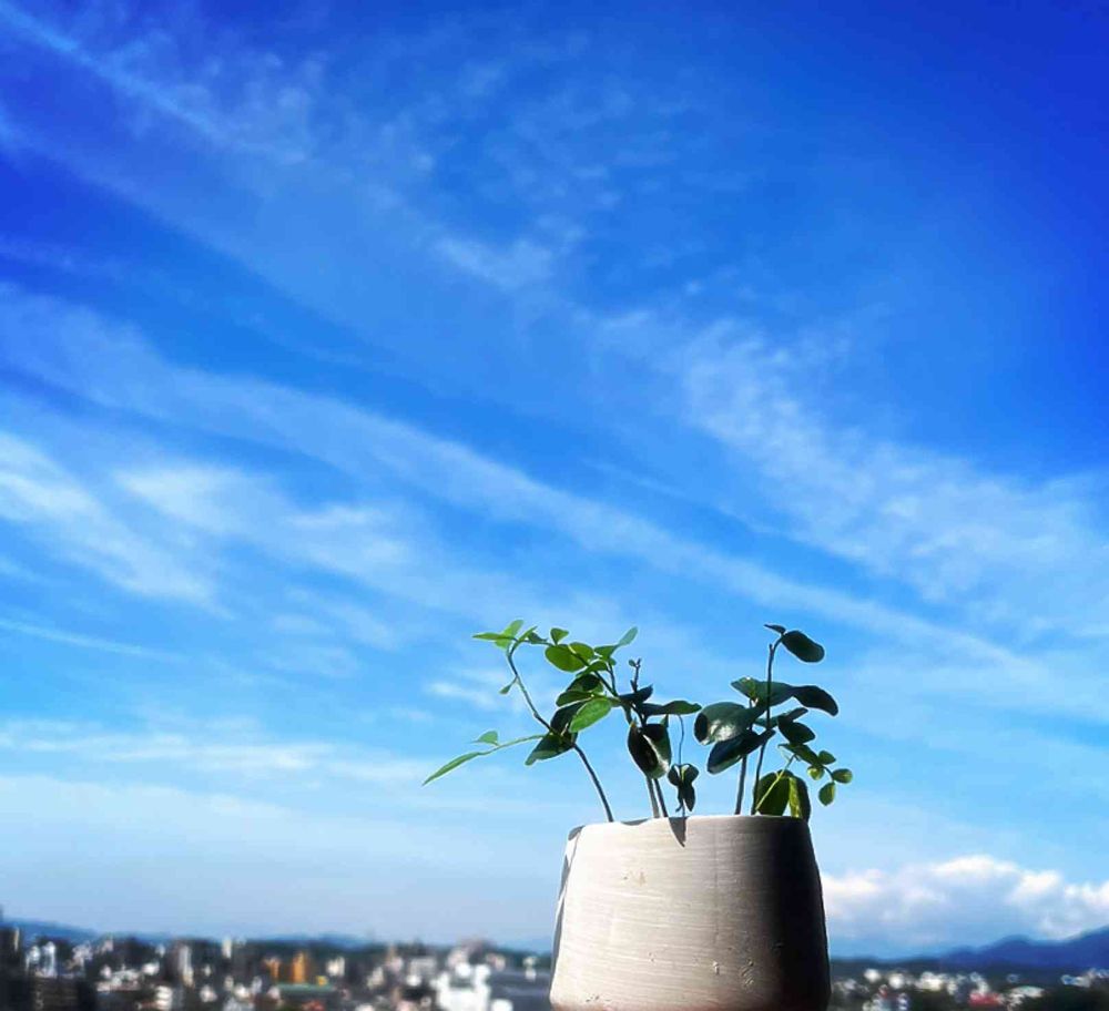 初夏の空と遠くに望む山や街並みの遠景に、緑を抱く鉢の白さが際立つ鮮やかな画ですね!