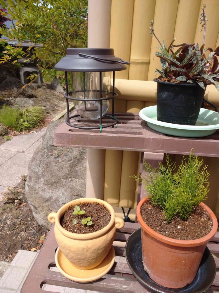 和と洋だわ~笑 勝手に生えたシリーズの「コキア」「レモンバーム」移植してみました。合ってるのかはわかりませんが…全て再利用品でSDGsですね!(テキトー)