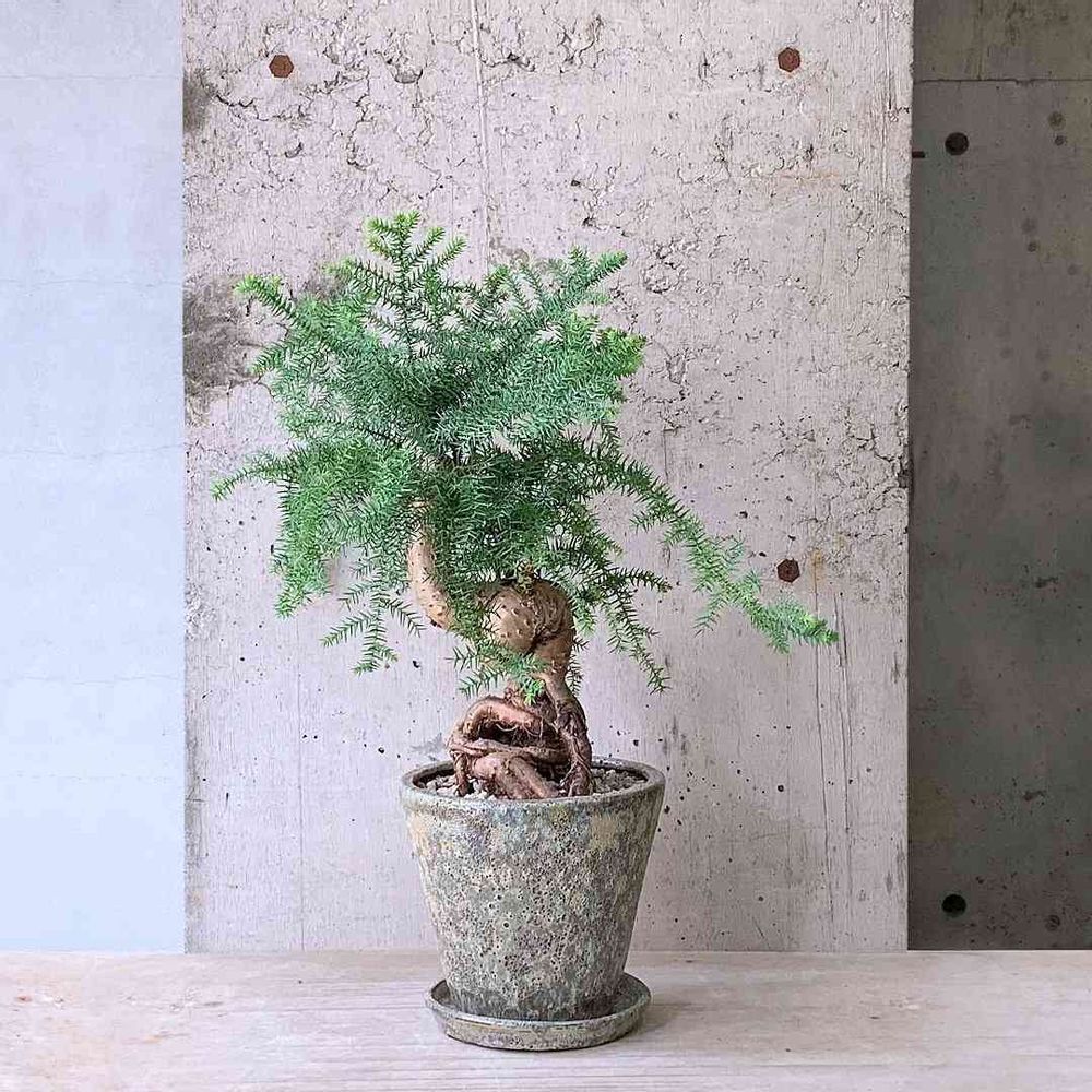 ブロンズカラーの力強いねじれのある樹形が荒々しく、剥がれかけている樹皮の様が男前なひと鉢です。