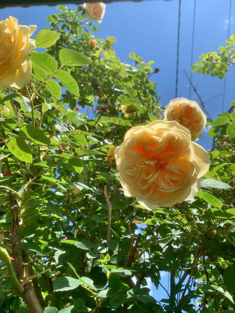 ティージングジョージア満開です。少し下向きに垂れ下がるのでなるべく高い方へ誘引してます。