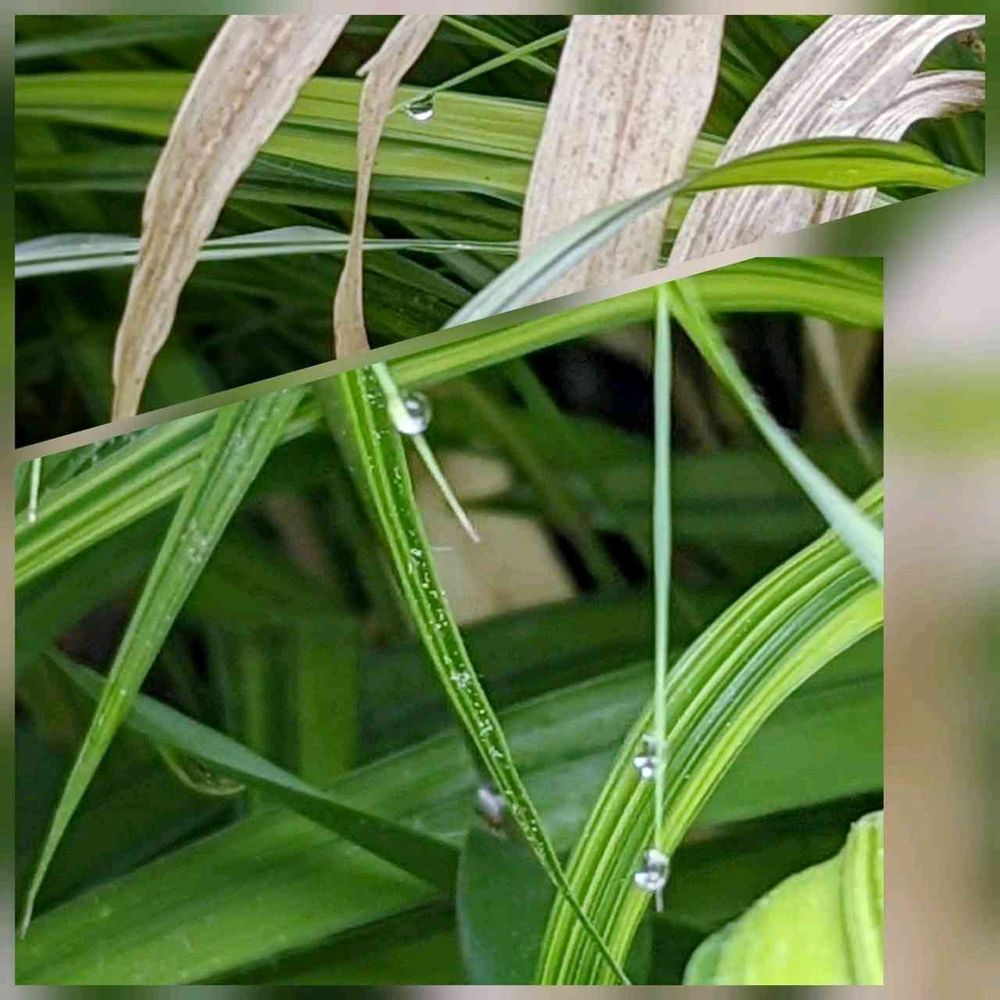 今朝 アプローチの風知草に朝露きらり…これはモコさんに教えて頂いた溢液現象のようです