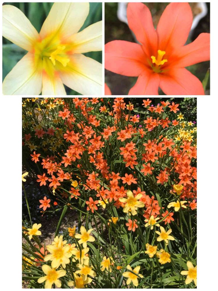 狭い庭にこぼれたホメリアの球根が10年経ってこんなに咲き誇っています。
