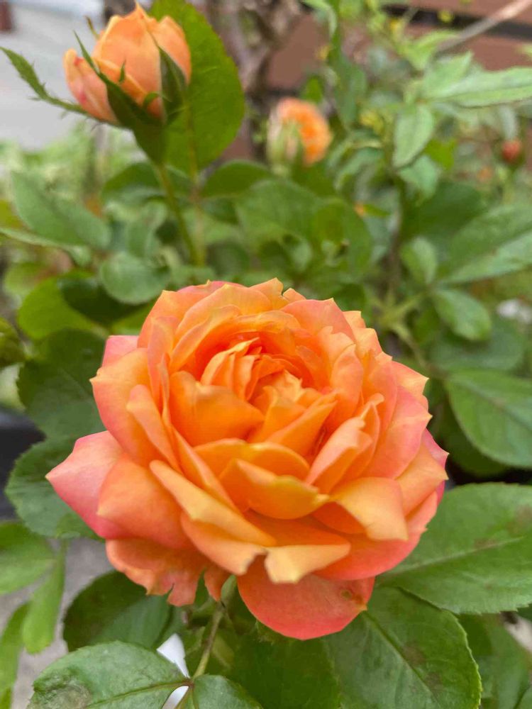 コロンとしたロゼット咲きの花形とオレンジとピンクが交じり合った花色。