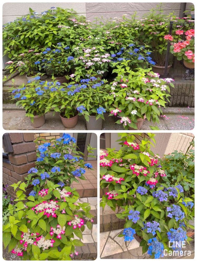 白からピンク色になっていた山紫陽花が並べられているお家を通りかかると、山紫陽花が赤くなっていました。