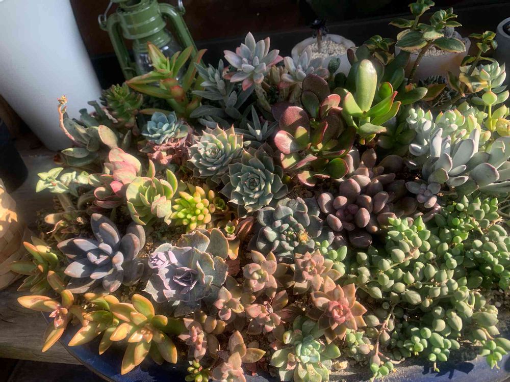 朝日を浴びた多肉ぎゅーぎゅー寄せ植え鉢