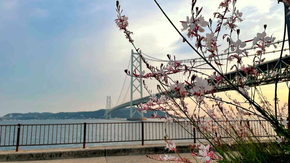 白いガウラさんと後ろの橋との景色がいい感じの写真です〜*(((o(*゚▽゚*)o)))