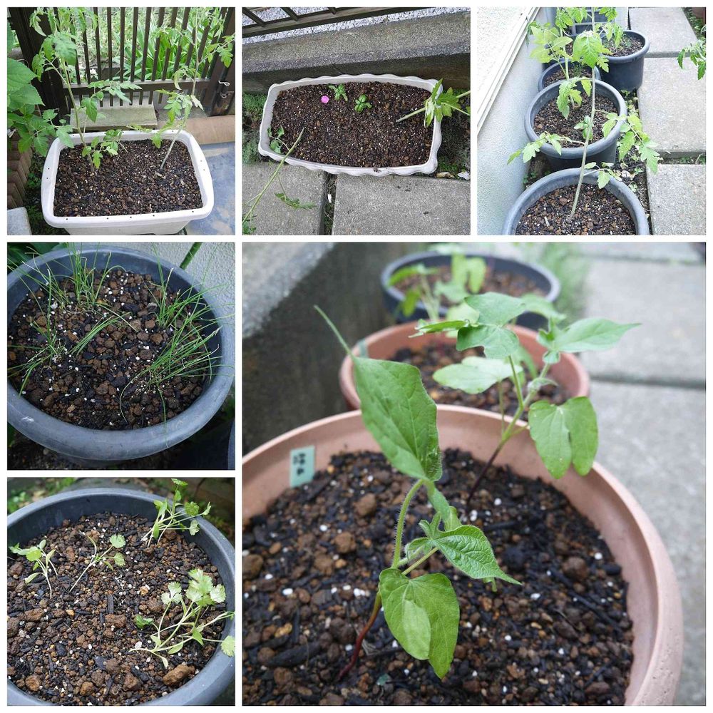 左の2、3枚目は、ニラとパクチー。ニラは菊鉢に計4鉢植えました。パクチーは2鉢だったかな。