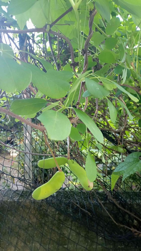 なんて豆なんだろうと葉を見ると 謎が解けました アケビだったのです。🤗