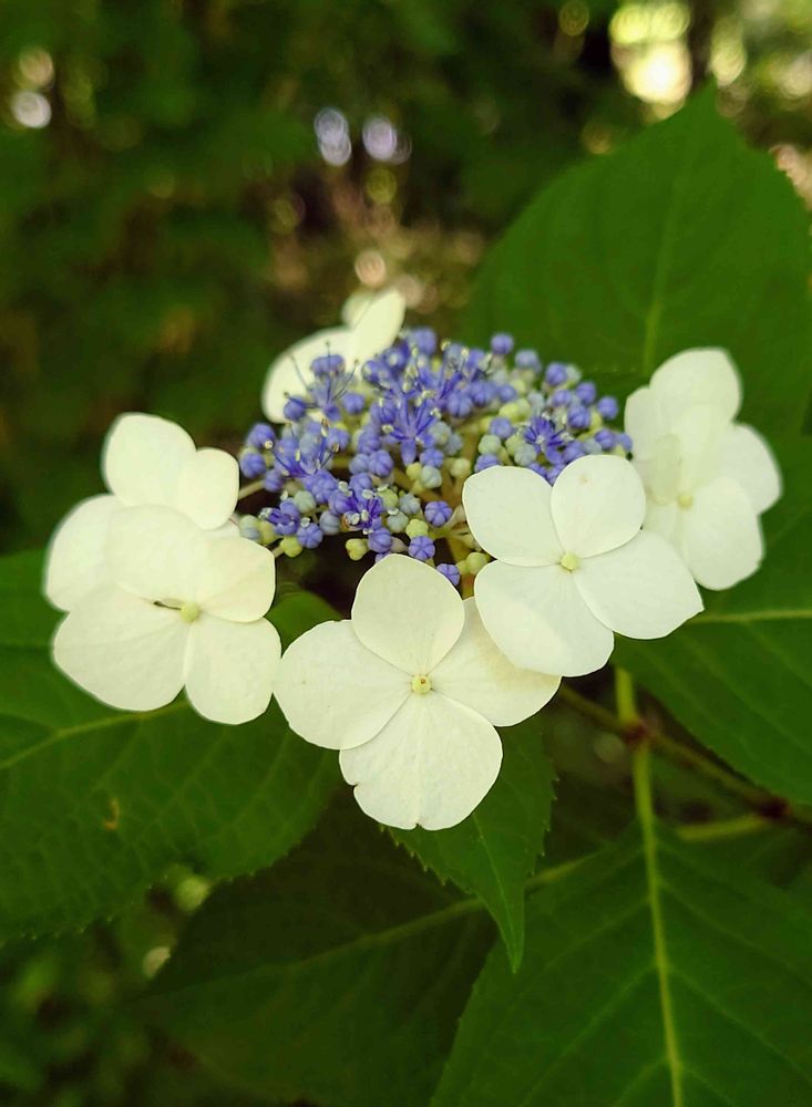 青いエゾアジサイの花の両性花が青くなって来ました、少し咲き始めているようです💙
