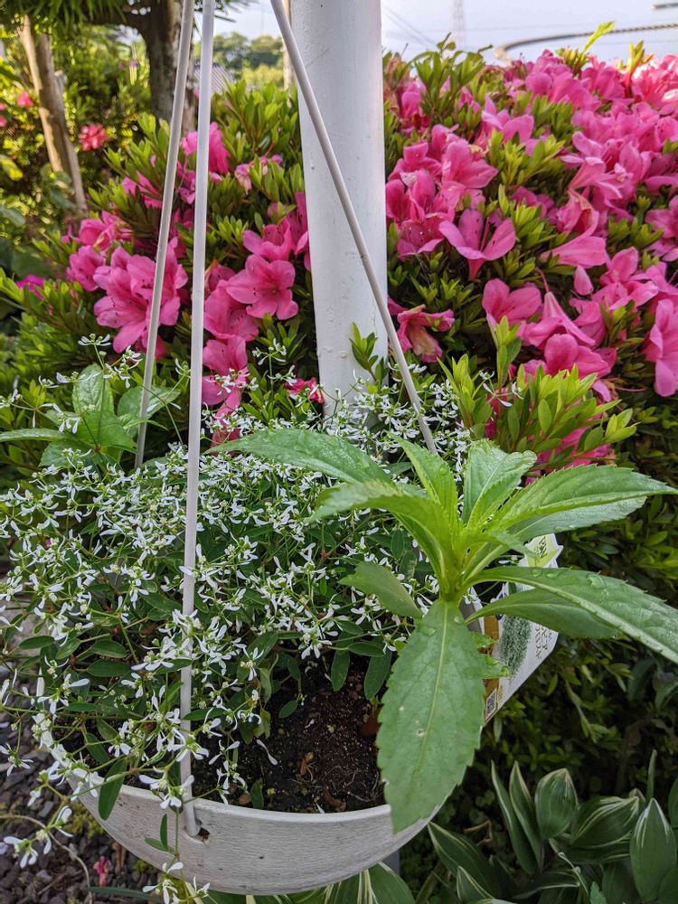 昨日。ふと、思いつき!寄植えの中に、無理やり、入れ込んでみた~どうやら後の祭りになるだろう。🤔🙄😱😅