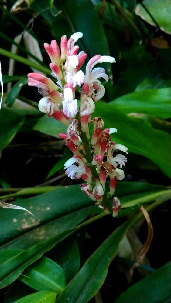 大きな葉っぱと長く伸びた花茎が特徴で、花は白にピンク色の筋がある💚ハナミョウガ💚のお花がとても綺麗でした😍💖
