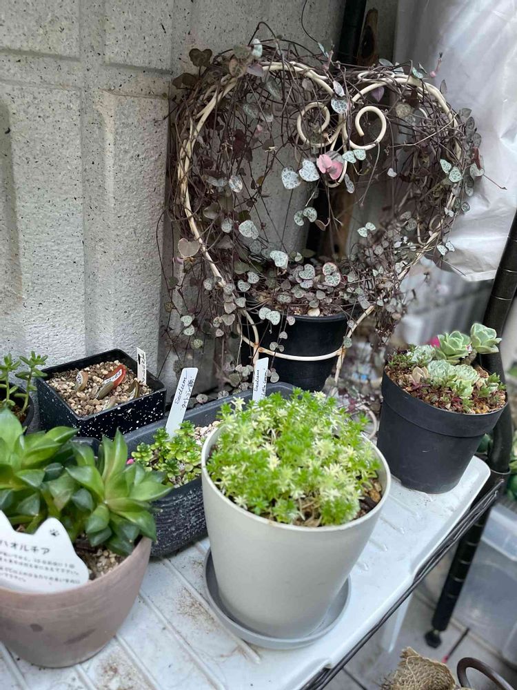 ハートカズラがハートに絡まってるー😃💕葉っぱがたくさんあって植え替えが難しそうですね😅