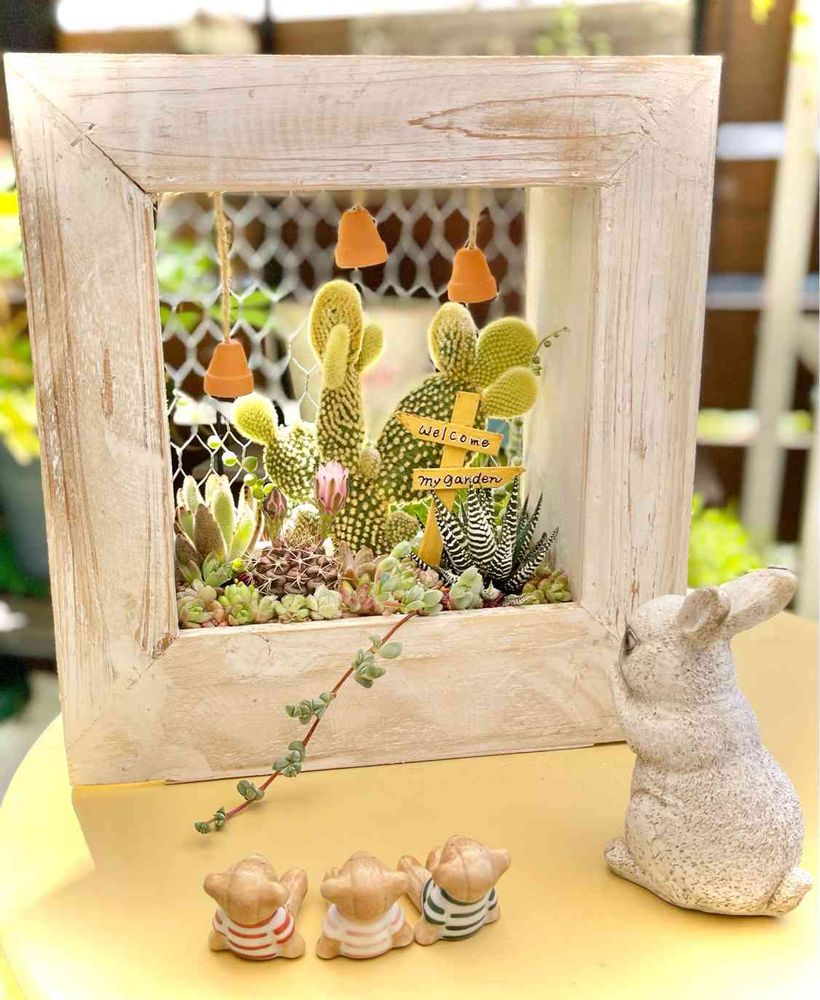 額に入った寄せ植え、ナイスアイデア
